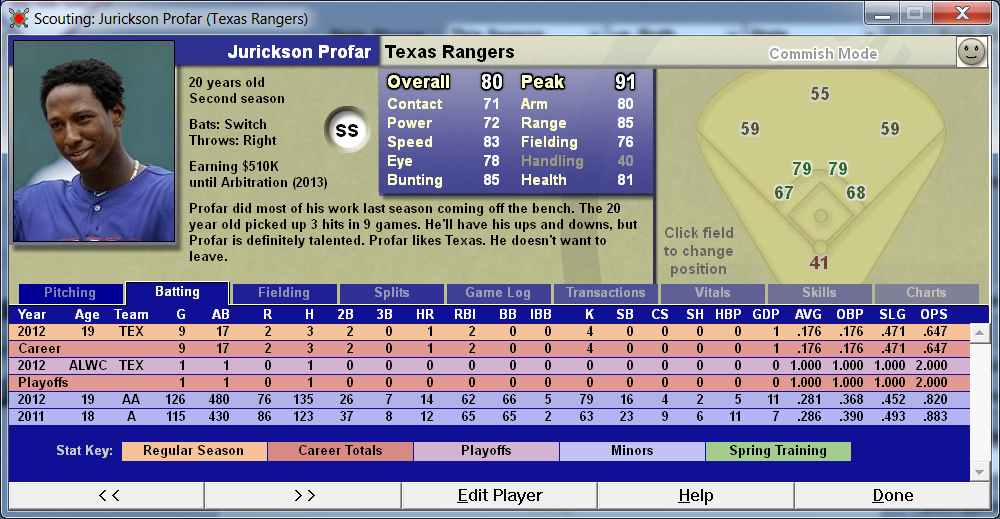 As reported, the ratings for all the fielders are in the wrong place on the field (as are the outfield fence distances). This is because every stadium photo requires a matching text file that specifies the coordinates that Baseball Mogul needs to use when drawing these labels.