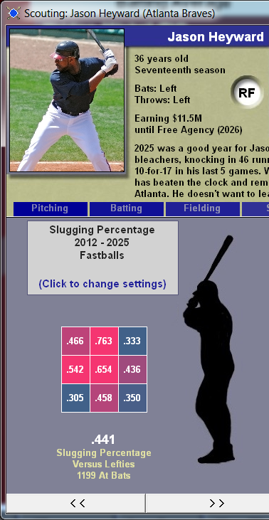 You can also limit the search to certain pitch types (fastballs, sliders, etc.) and situations (2 outs, RISP, "close and late"). For example, here's Jason Heyward's Slugging Percentage on just fastballs: